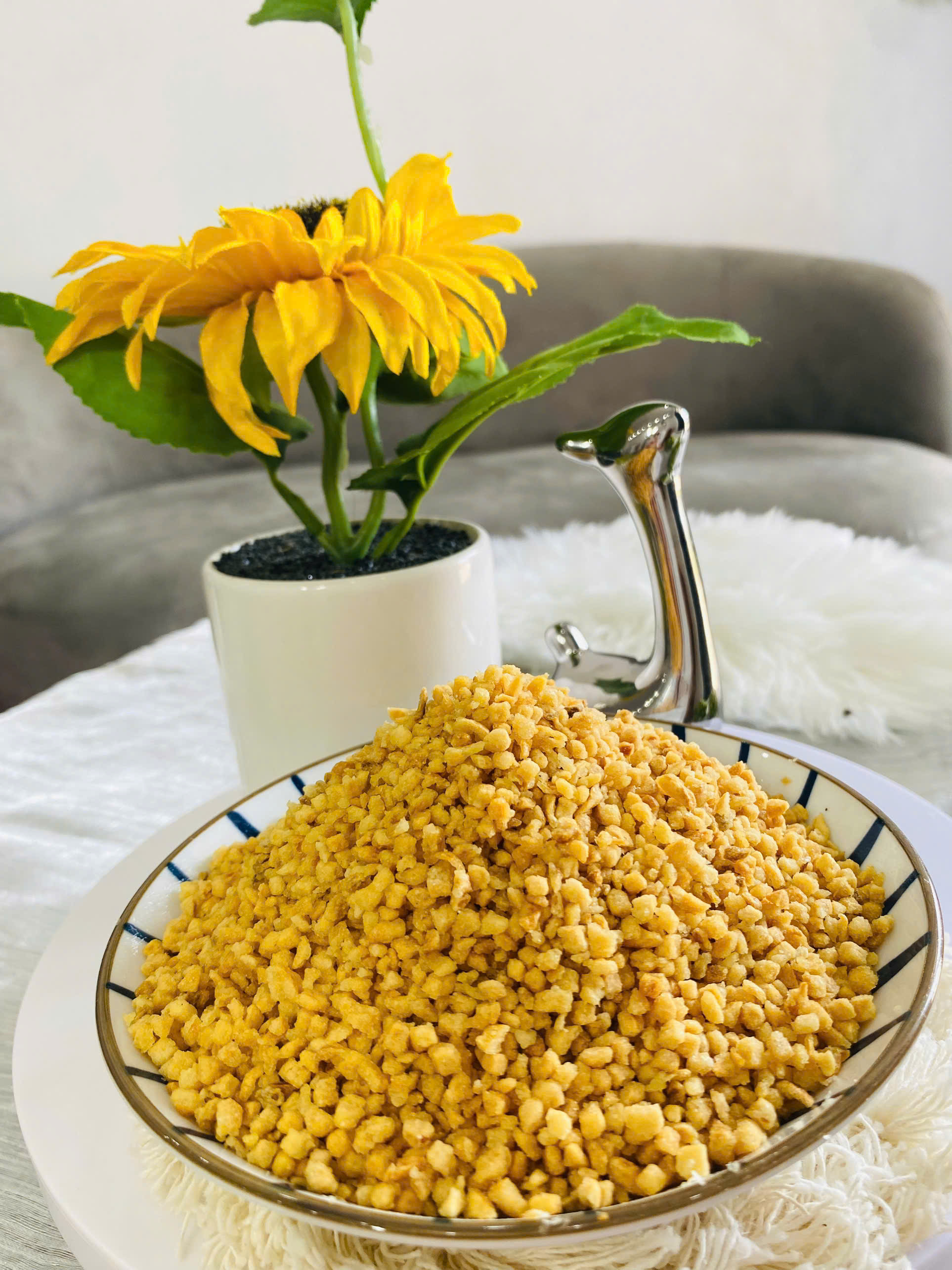 Tỏi băm phi là gia vị quen thuộc, giúp món ăn dậy mùi thơm đặc trưng và tăng vị hấp dẫn ngay từ lần nếm đầu tiên. Tỏi được băm nhỏ vừa tay, phi chín vàng đều bằng dầu sạch, cho ra thành phẩm giòn thơm – không đắng – không ngấy.